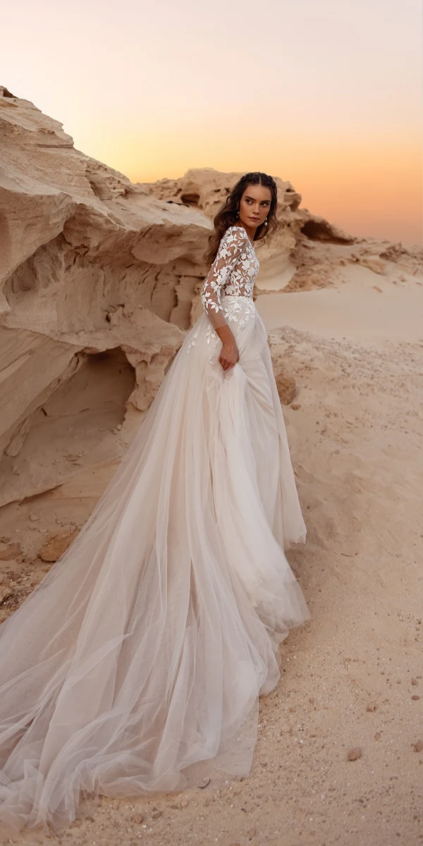Armori est une robe conçue pour les mariées en quête d'une allure romantique, raffinée et d'une féminité naturelle. Son décolleté en V plongeant sublime la silhouette, tandis que le corsage ajusté, orné d'appliqués de dentelle florale, attire le regard par sa délicatesse. Les longues manches transparentes offrent une légèreté aérienne, finies par une dentelle assortie qui se fond harmonieusement dans le design. La jupe fluide en tulle crée un mouvement souple, conférant à la robe une élégance aérienne et gracieuse, à la fois saisissante et discrète. Cette robe est faite pour les femmes qui souhaitent se sentir confiantes, gracieuses et inoubliables le jour de leur mariage – une création qui allie douceur et force dans les moindres détails.