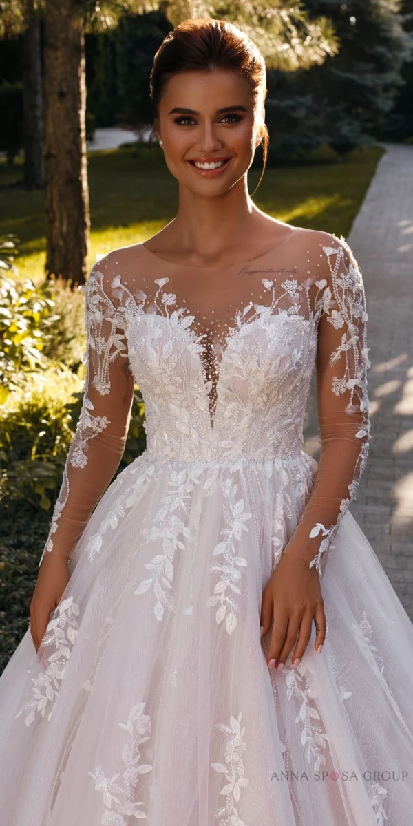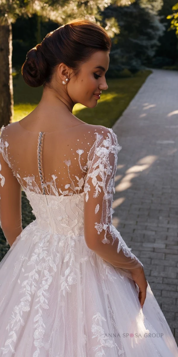 Dites oui à la robe de vos rêves ! Cette sublime robe de mariée princesse d'Anna Sposa vous sublimera le jour J avec son élégance intemporelle. Son bustier structuré orné d'appliques florales en dentelle se prolonge par des manches longues transparentes finement brodées. La jupe volumineuse en tulle vaporeux crée une silhouette royale digne des contes de fées. Un modèle d'exception à découvrir chez Monica Mariage près de Toulouse. Essayage sur rendez-vous