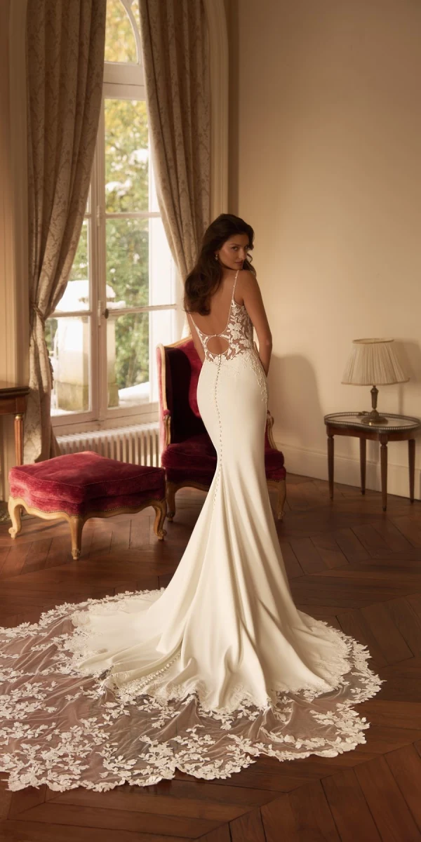 Sublime robe de mariée sirène Vegas en dentelle , ornée de motifs floraux délicats. Décolleté en V plongeant, dos nu sophistiqué et coupe ajustée qui épouse parfaitement les courbes. Son tulle scintillant ajoute une touche d'éclat glamour. Cette création exclusive est disponible pour essayage chez Monica Mariage, près de Toulouse