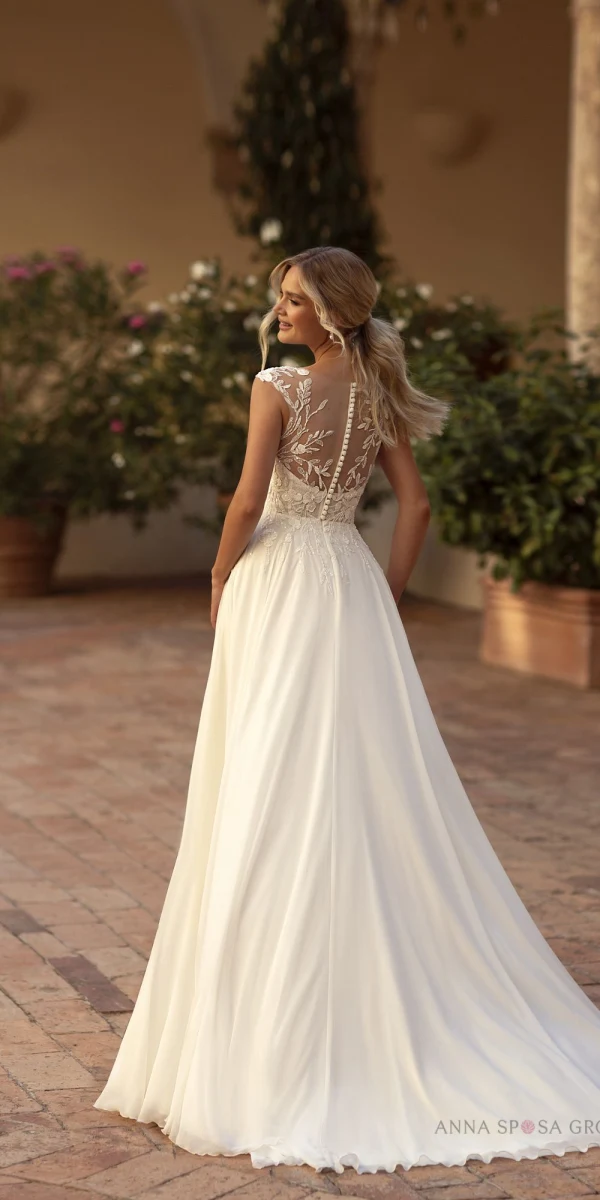 Cette création signature d'Anna Sposa, plébiscitée pour son alliance de raffinement et d'audace, est disponible chez Monica Mariage près de Toulouse. Essayage sur rendez-vous.