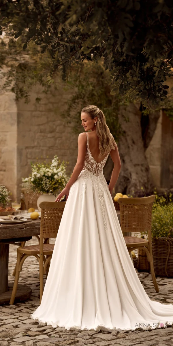 Le corsage est orné de dentelle florale, brodée de perles et sequins. Le décolleté en V profond et le dos ouvert apportent une touche sensuelle et impressionnante au look.